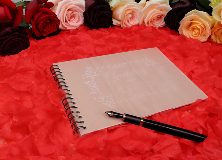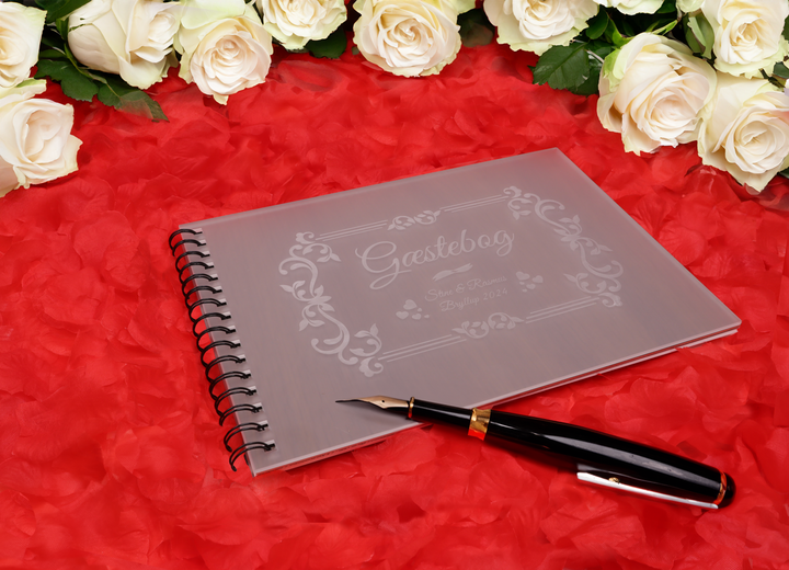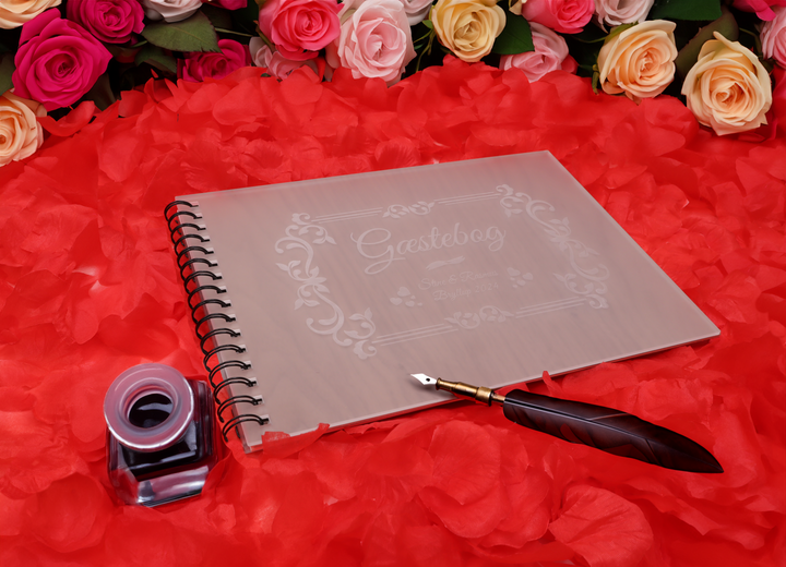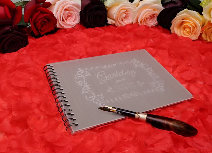 Lavet af højkvalitets akryl er denne gæstebog både holdbar og smuk. Den er nem at bruge og kan tilpasses med jeres navne, bryllupsdato eller andre personlige detaljer. Den er også nem at rengøre, så den forbliver perfekt som en del af jeres bryllupsminder.