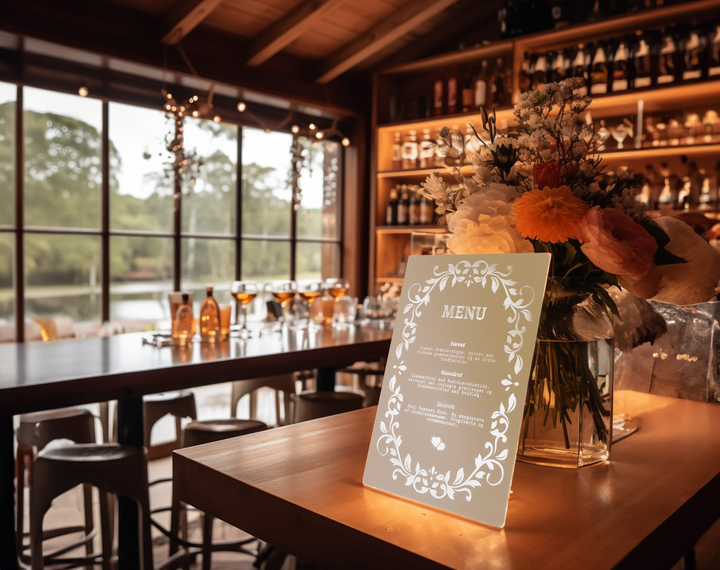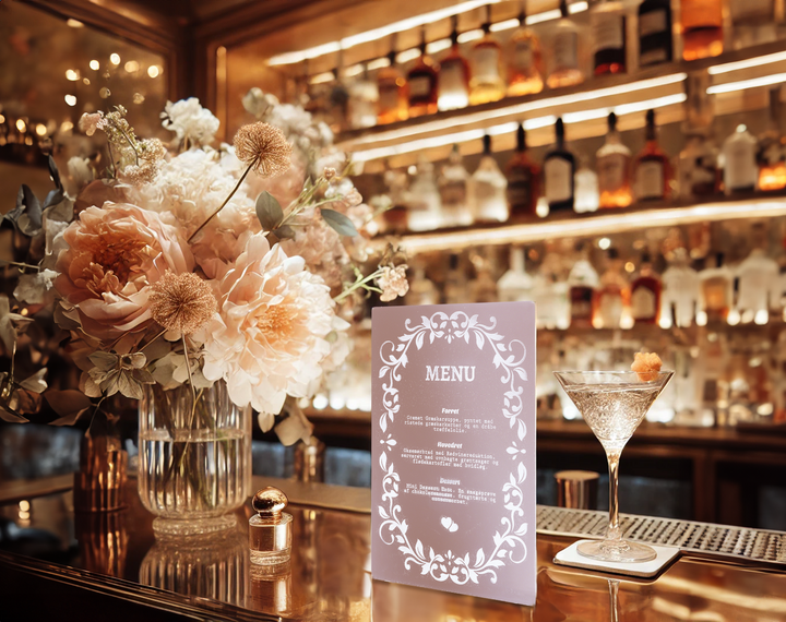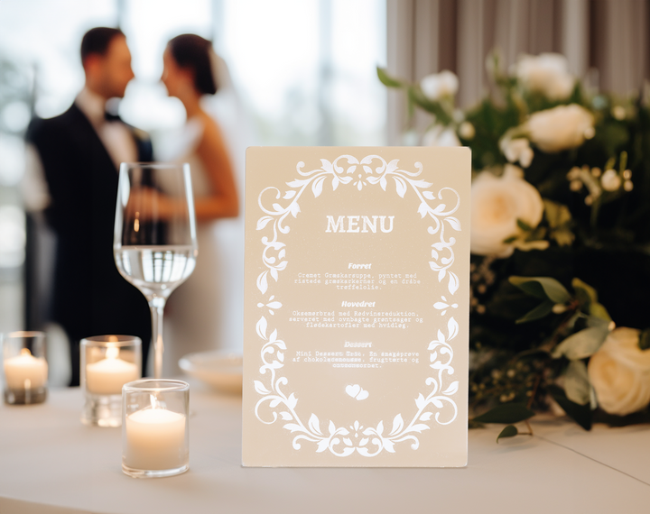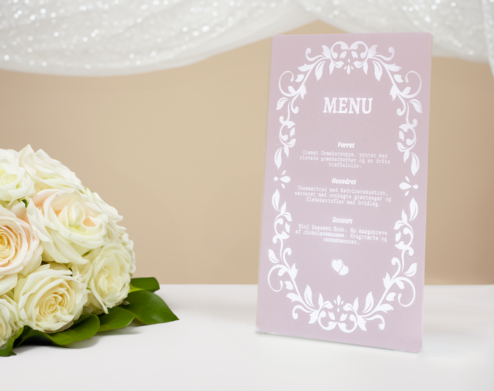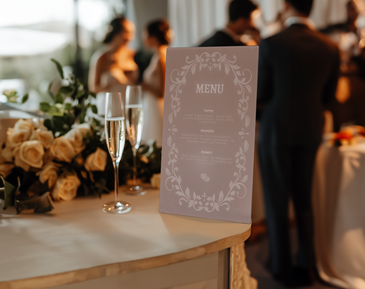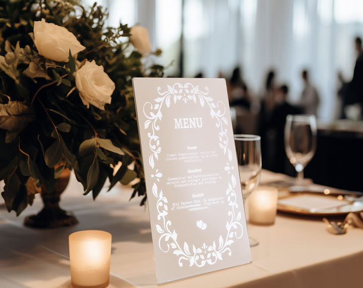 Forestil jer jeres kære beundre det smukt indgraverede menukort, mens de tager plads ved bordet, hvor stearinlysenes skær reflekteres blidt på den glatte akryloverflade. Dette betagende menukort fungerer ikke blot som en praktisk oversigt over aftenens menu, men også som et stilfuldt midtpunkt, der forhøjer helhedsudtrykket af jeres bryllupsmiddag.