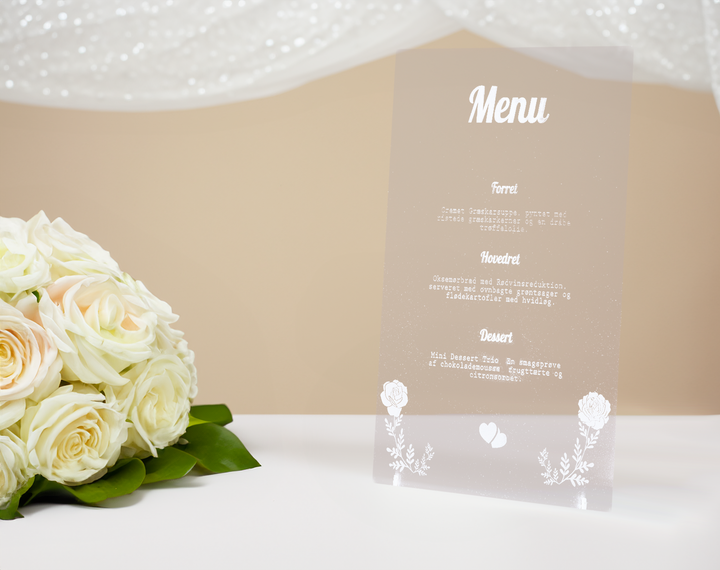 Holdbart og ridsefast sikrer dette menukort, at det bevarer sit fejlfri udseende gennem hele arrangementet, så jeres gæster nemt kan læse den nøje udvalgte menu. Den alsidige gennemsigtige akryl tilfører en sofistikeret elegance til jeres bordopstilling og løfter hele spiseoplevelsen for jer og jeres gæster.