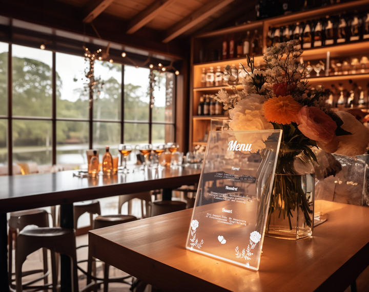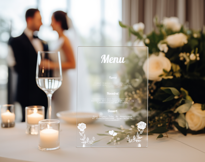 Strålende gennemsigtigt akryl bryllupsmenu kort – Stilfuld præsentation af jeres kulinariske oplevelse