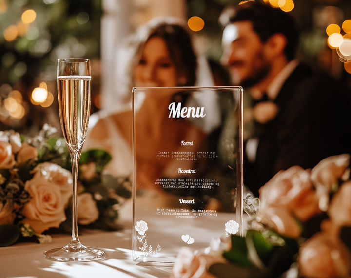 Giv jeres bryllupsmiddag et eksklusivt touch med det strålende gennemsigtige akryl bryllupsmenu kort. Fremstillet af højkvalitets gennemsigtigt akryl fungerer dette stilfulde menukort som en elegant præsentation af de lækre retter, I har sammensat til jeres gæster. Det krystalklare design fremhæver den smukt indgraverede tekst og skaber en indbydende, moderne atmosfære, der vil fascinere alle ved jeres fest.