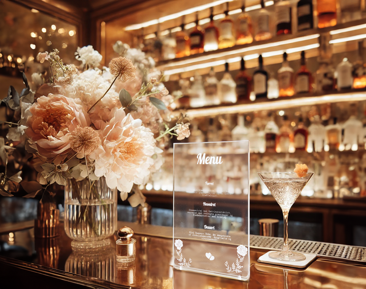 Forestil jer jeres gæster tage plads ved et smukt dækket bord, hvor dette elegante menukort møder deres blik og forstærker forventningen til den kommende kulinariske oplevelse. Dets slanke og moderne æstetik gør det perfekt til enhver bryllupsstil – fra glamourøse aftenevents til afslappede udendørsfejringer. Den gennemsigtige akryl smelter harmonisk sammen med borddekorationen og lader blomsterarrangementer og stearinlys skinne smukt igennem.