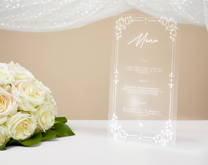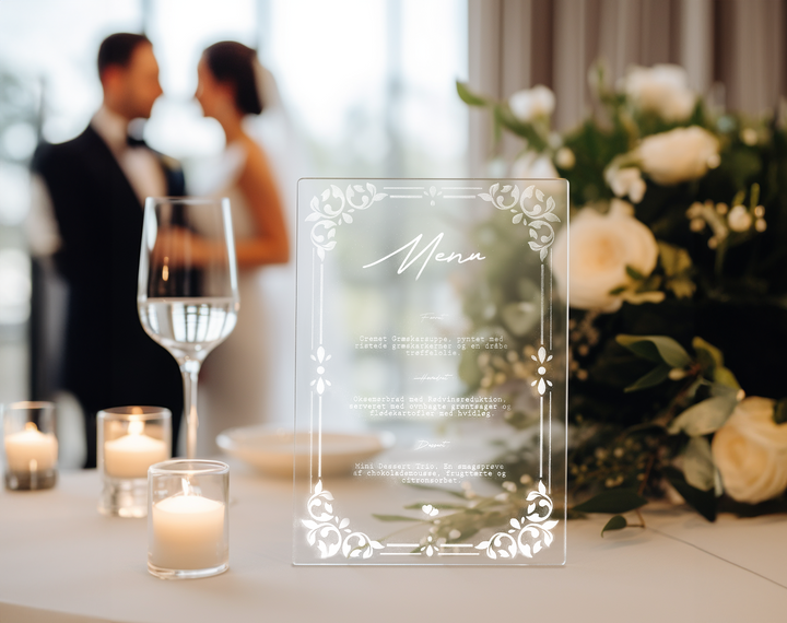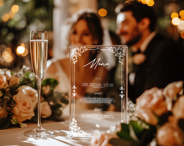 Krystalklart akryl bryllupsmenu kort – Stilren borddekoration til jeres kulinariske fejring