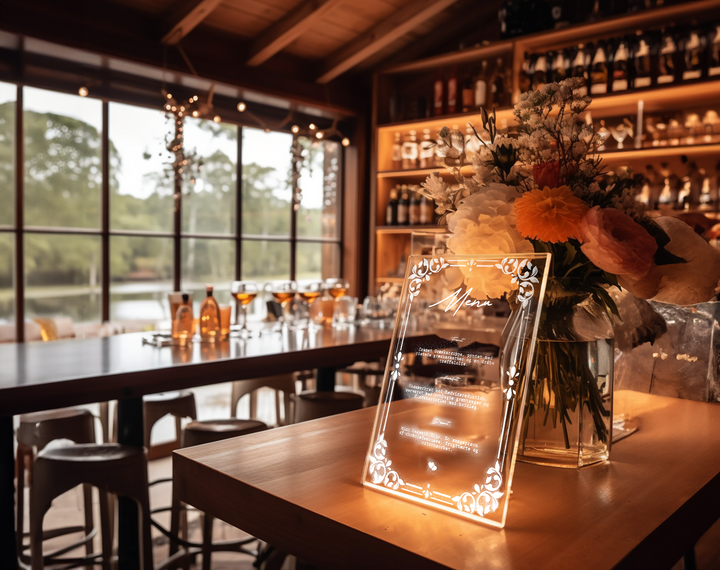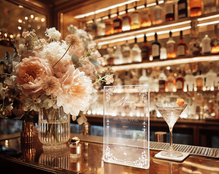 Giv jeres bryllupsmiddag et eksklusivt og stilfuldt præg med det krystalklare akryl bryllupsmenu kort. Fremstillet af premium gennemsigtigt akryl præsenterer dette slanke menukort jeres nøje udvalgte retter på en elegant og raffineret måde. Den krystalklare overflade fremhæver den smukke indgravering og skaber et iøjnefaldende element, der løfter jeres borddækning.